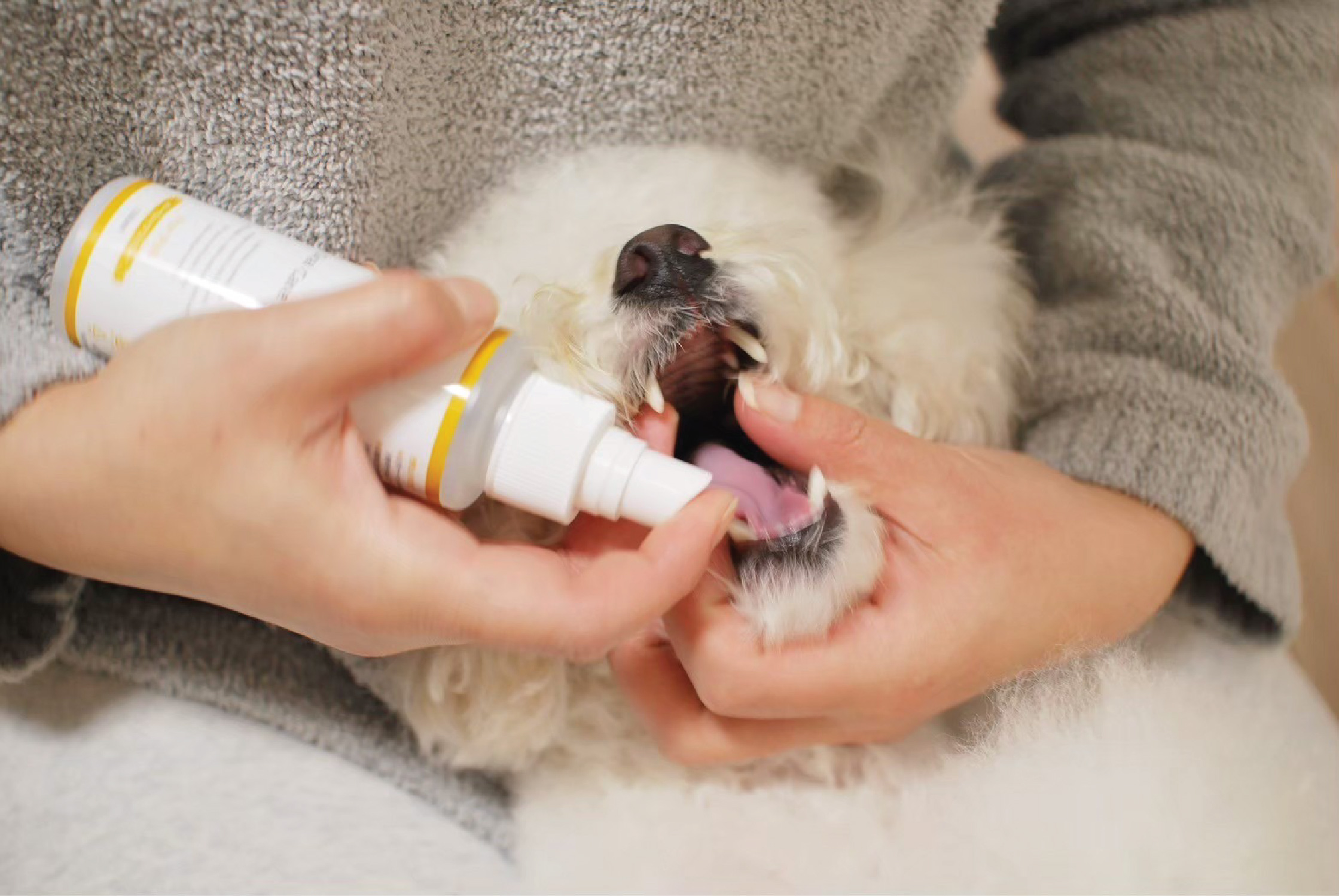 สเปรย์ดูแลช่องปากช่วยรักษาสุขภาพช่องปากของสัตว์เลี้ยงของคุณ ผลิตจากสารสกัดจากพืชธรรมชาติ 108 ชนิด ซึ่งมีส่วนผสมของสะเดา คลอโรฟิลล์ ฯลฯ ในอินเดีย กิ่งสะเดาเป็นที่รู้กันว่าใช้เป็นแปรงสีฟัน การมีสะเดาและคลอโรฟิลล์ช่วยให้ลมหายใจของสุนัขหรือแมวของคุณสดชื่นและมีสุขภาพช่องปากที่ดี นอกจากนี้ การฉีดอนุภาคกรดอะมิโนลงบนพื้นผิวฟันยังช่วยรักษาสุขภาพฟันอีกด้วย คราบจุลินทรีย์ที่สะสมในร่องปริทันต์จะกลายเป็นหินปูนภายใน 3 ถึง 5 วัน ดังนั้นจึงแนะนำให้แปรงฟันสัตว์เลี้ยงของคุณด้วยแปรงสีฟันและนวดร่องปริทันต์เพื่อช่วยป้องกันการสะสมของสิ่งสกปรกและหินปูน วิธีที่มีประสิทธิภาพที่สุดในการใช้สเปรย์ดูแลช่องปากคือการฉีดโดยตรงเข้าไปในปาก หรือแช่ในสำลี หรือฉีดบนแปรงสีฟันและใช้ทุกวัน